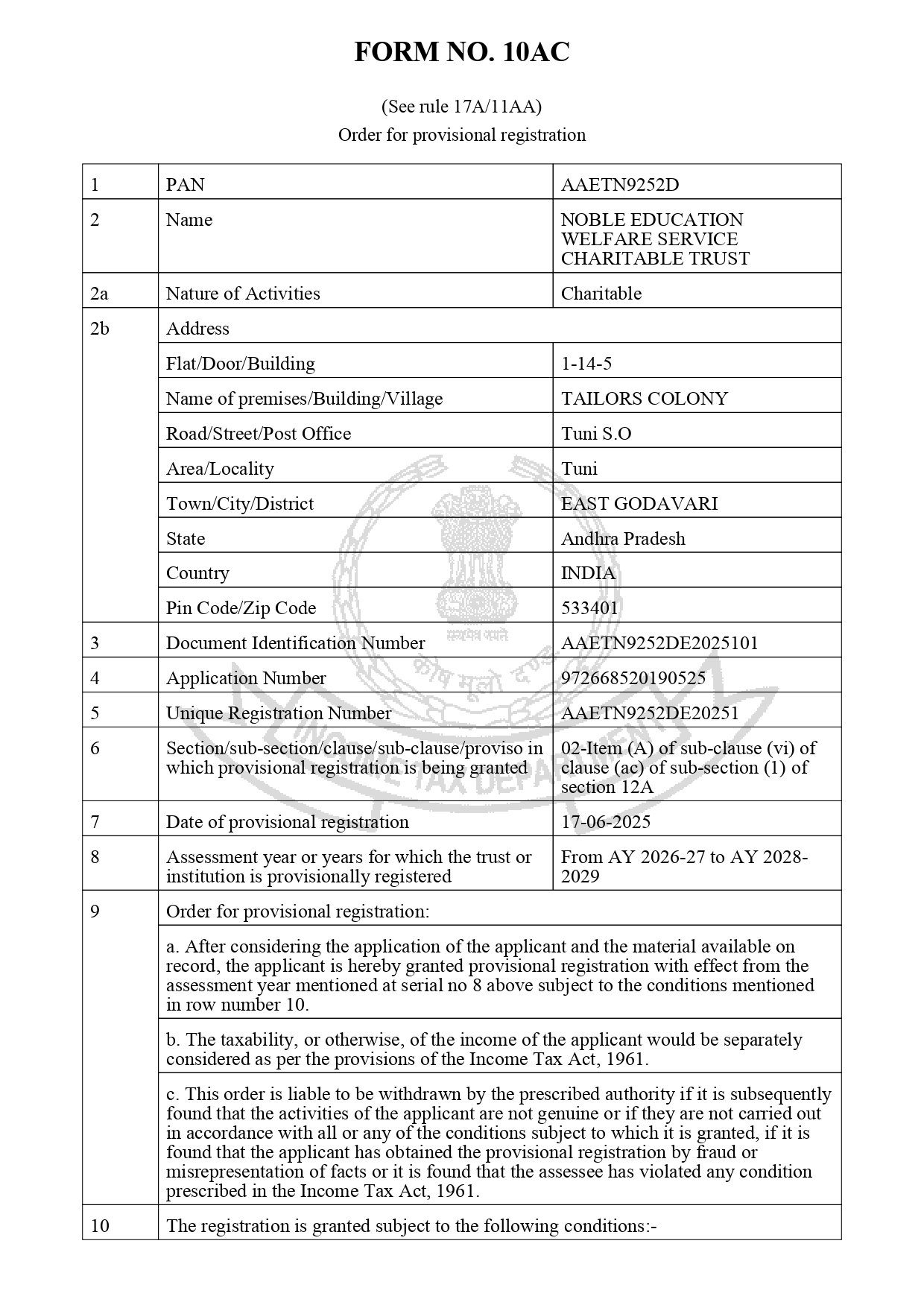 The NOBLE EDUCATION WELFARE SERVICE CHARITABLE TRUST